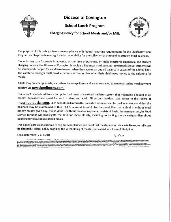 Information on The Diocese of Covington School Lunch Program Charging Program