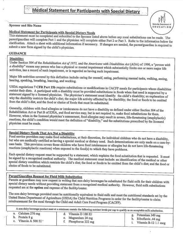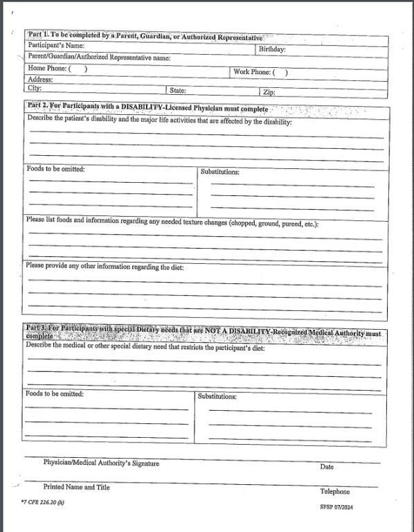 Information on Dietary Needs/Form to Print Out: Page 1 and Page 2