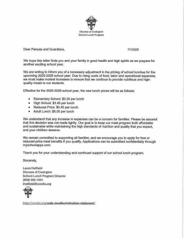 Information on School Lunch pricing for the 2025-26 School year.
